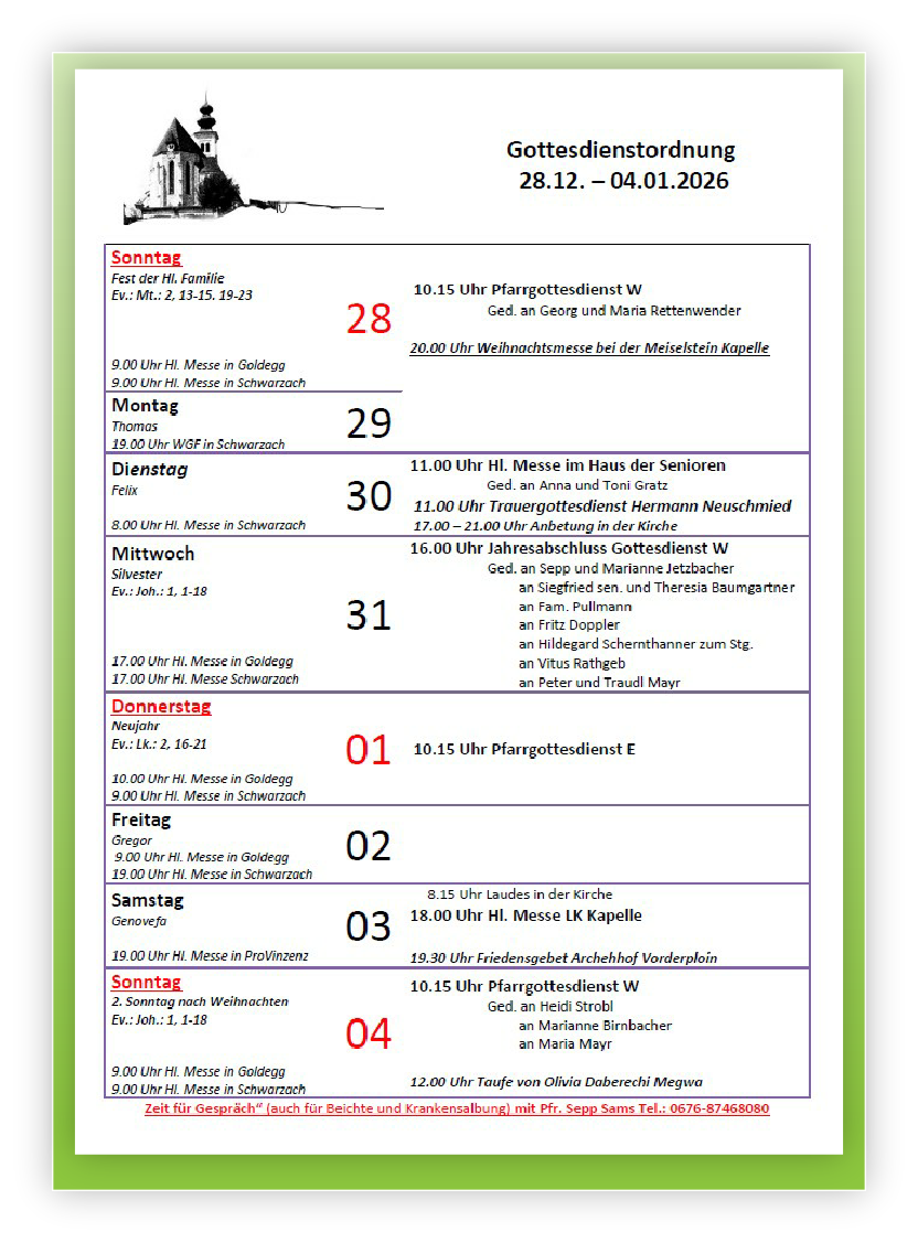 „Zeit für Gespräch“ (auch für Beichte und Krankensalbung) mit Pfarrer Sepp Sams Tel.: 0676-87468080