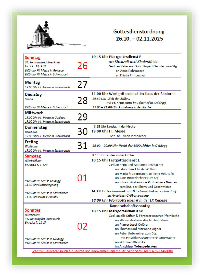 „Zeit für Gespräch“ (auch für Beichte und Krankensalbung) mit Pfr. Sepp Sams Tel.: 0676-87468080