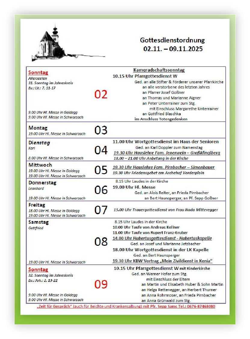 „Zeit für Gespräch“ (auch für Beichte und Krankensalbung) mit Pfr. Sepp Sams Tel.: 0676-87468080