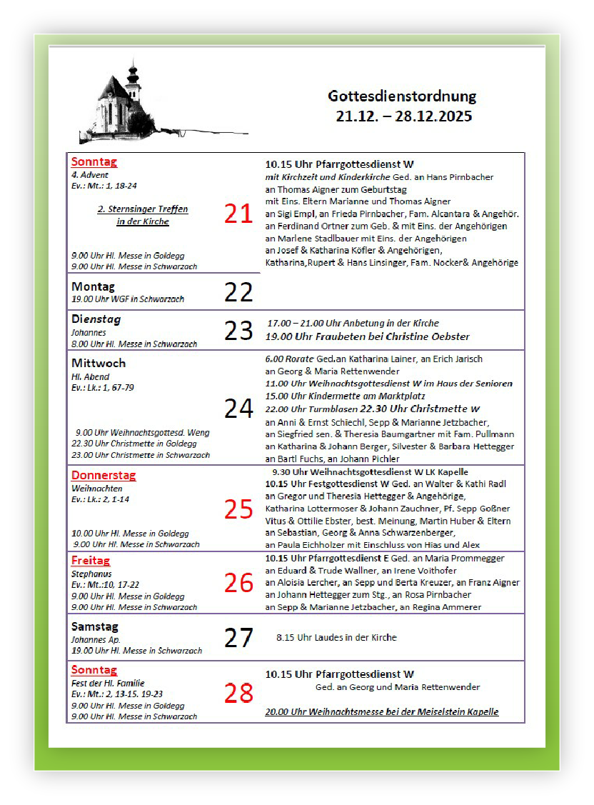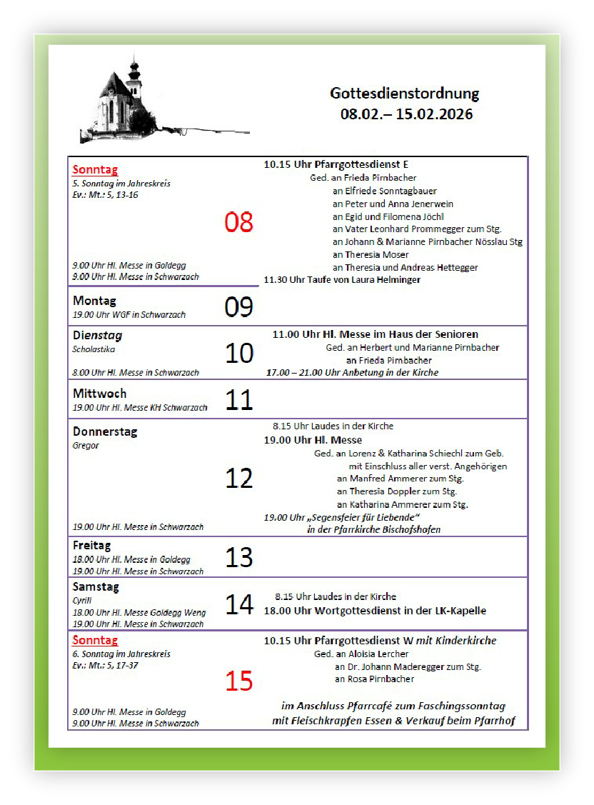„Zeit für Gespräch“ (auch für Beichte und Krankensalbung) mit Pfarrer Sepp Sams Tel.: 0676-87468080